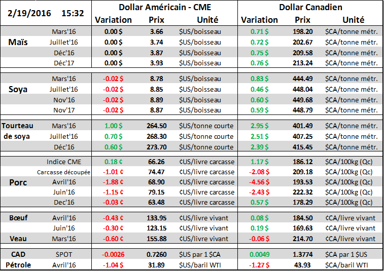 Le rapport mensuel Cattle-on-Feed semble à priori neutre pour les prix. En ligne avec les estimés (tableau 1), il y avait autant de bœufs en parc au 1er février 2016 qu’en 2015, soit 10.7 millions têtes. Toutefois, il y a eu légèrement plus de placements qu’anticipés, mais on reste à des quantités plus faibles que celles de janvier 2015 par -0.6%. Au total, 1.78 million de bêtes ont été placées en parc alors que seulement 1.6 million ont quitté pour l’abattoir ce qui cause une augmentation de 134 000 bœufs comparativement au 1er janvier. Le prix du bœuf est toujours dans sa tendance baissière depuis plusieurs mois et le rapport d’aujourd’hui ne semble pas assez positif pour que la situation change à court terme.