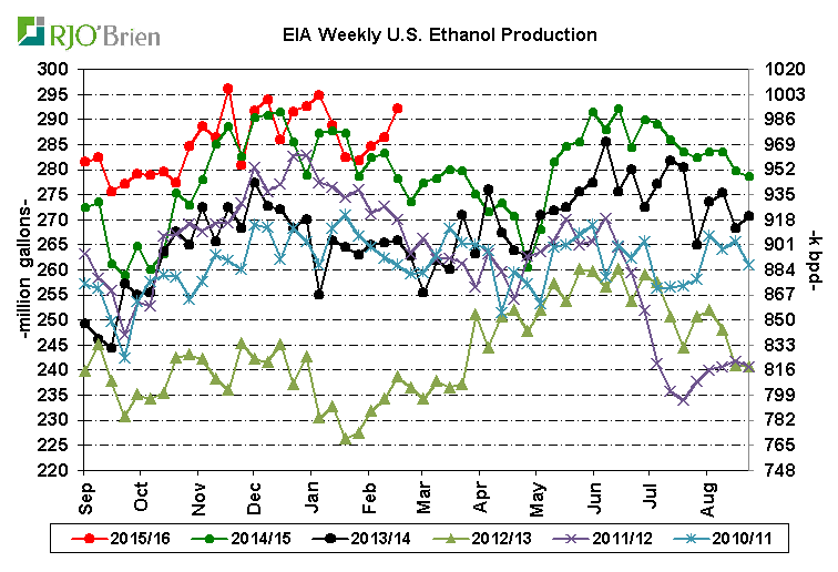 Le rythme actuel de production est supérieure au projection de l’USDA pour l’utilisation de mais dans la fabrication d’éthanol. Depuis le début de l’année de commercialisation la production moyenne est à 971,000 barils/jours c’est 2.5% plus élevé que l’an passé et mieux que le 1.6% nécessaire pour atteindre 5.225 milliards de boisseaux de maïs pour 2015/16.