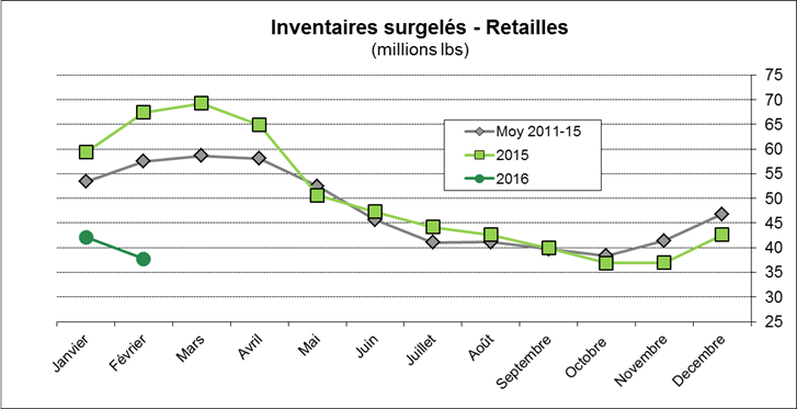 En février, le prix de la découpe de boeuf était relativement faible et a commencé à remonter seulement à la mi-mars. Apparemment, l’offre de bœuf en février ne suffisait pas pour combler la demande ce qui a fait baisser les inventaires surgelés de 28 millions livres à 490.6 millions (graphique 1). C’est un peu contradictoire à la baisse du prix des découpes. En janvier, les inventaires surgelés de bœuf était 5% de plus qu’en 2015 et 10% de plus que la moyenne quinquennale. Avec la baisse d’inventaire en février, nous sommes en direction vers un retour à la moyenne, désormais à seulement 5% de plus que la moyenne.