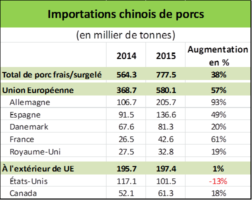 Tableau 6 – Importation de porcs en Chine en 2014 et 2015