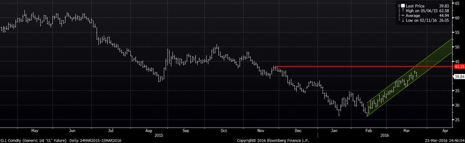 Le prix du pétrole a baissé de 4% aujourd’hui, retournant sous la barre du 40$US/baril. La baisse s’est accélérée après la publication des inventaires hebdomadaires qui dévoilent des réserves record de 533 millions barils, soit 60 millions de plus que l’an dernier à pareille date (graphique 3). Le prix du pétrole demeure toujours dans sa tendance haussière, mais fait face à quelques résistances technique entre 43 et 50$US/baril (graphique 4).