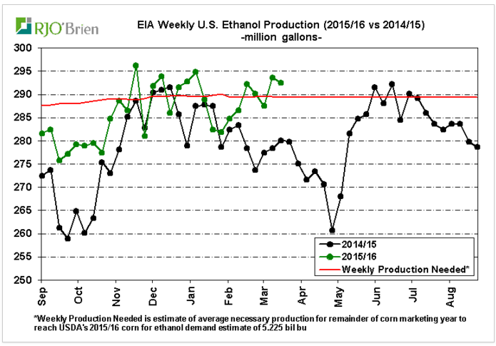 La production d’éthanol continue de frôler le 1million de barils par jour (tableau 1) ce qui est un peu plus que la cadence nécessaire pour atteindre la cible de l’USDA (graphique 2). Contrairement à cet hiver, en plus d’une forte production, les inventaires se contractent grâce à une demande de gazoline extrêmement forte, pratiquement à un record pour cette période de l’année, soit 9.50 million barils de gazoline par jour. Bref, les inventaires d’éthanol ont diminué de 334 000 barils à 22.5M barils la semaine dernière ce qui est un léger recul après les inventaires records de 23.3M barils il y a deux semaines.