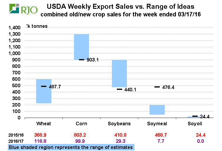 Blé : À 369k tonnes c’est respectable, c’est même mieux que prévu en réalité. Avec seulement 10 semaines à faire sur l’année de commercialisation 2015/16, il y a encore beaucoup de chemin à faire si le ministère pense atteindre 775 millions de boisseaux! À ce jour les ventes sont évaluée à 696 millions, soit une baisse de 17% par rapport à l’an dernier alors que l’USDA estime la baisse à seulement 9%. Il faudrait que les américains exporte en moyenne 7.6 millions de boisseaux par semaine sur la meme période ou l’an passé elles étaient à 2.0 par semaine. Bref, fort possible que l’USDA révise les exportations américaines de blé, mais je ne crois pas que cela va « surprendre » le marché.