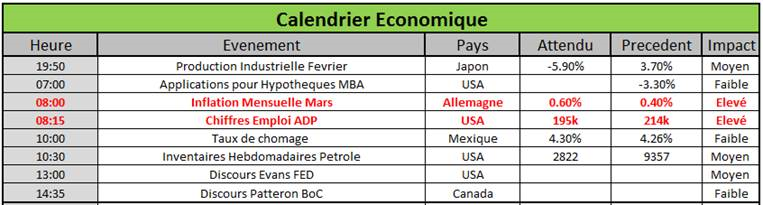 Aux Etats-Unis, nous surveillerons la publication du chiffre d’emploi ADP qui est attendu en hausse de 195k. C’est la seule publication sur l’emploi qui peut être utilisée pour « prévoir » le chiffre de Non Farm de Vendredi. En effet, les chiffres ISM seront cette fois-ci publiés après la publication des chiffres d’emplois Américains (Vendredi 10h pour ISM Manufacturier et Lundi pour le Non Manufacturier).
