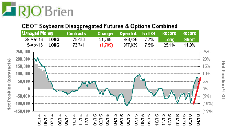 Les fonds de spéculation ont acheté un paquet de contrats à terme sur CBOT, près de 200,000 depuis un mois et c’est possible d’en ajouter si la situation prend de l’ampleur. Les fonds ont aussi un net long impressionnant dans les huiles et réduisent le net short dans le tourteau de façon assez claire. Définitivement quelque chose attirent leur intérêt.