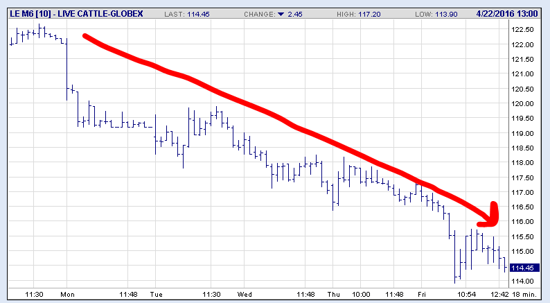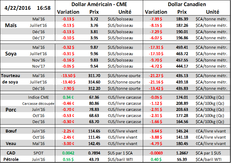 Cattle On Feed : le rapport sera perçu comme neutre à positif pour les prix. Il y a 2% moins de placement que prévu alors cela risque de réduire l’offre dans les mois futures. À mon avis le rapport ne montre pas d’information extrêmement « dangereuse » pour l’ouverture de lundi principalement parce que la forte chute des prix cette semaine limite probablement l’impact d’une rapport bearish. Juin a baissé de 8 cents cette semaine pour clôturer à 114.45 cent la livre. À suivre…