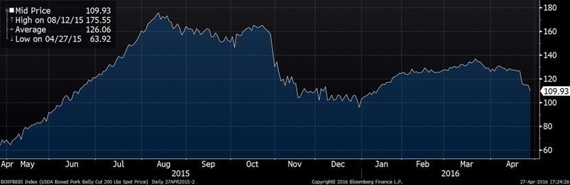 En parallèle, la valeur du porc découpée fait un nouveau sommet aujourd’hui, à 82 ¢/lb, reflétant une demande bien en santé. Le gros contributeur de la hausse de la découpe est le prix du jambon qui a gagné 26% depuis deux semaines (graphique 3) et retourne près de ses sommets de la dernière année à 69 ¢/lb (graphique 3). Aussi, lorsqu’on parle de saisonnalité du prix du porc, on s’attend à ce que le prix du bacon augmente avec l’arrivé de l’été. Ce n’est toutefois pas le cas. Le prix du bacon a beaucoup reculé depuis un mois (graphique 4), passant de 130 ¢/lb en mars ce qui était presque un record pour la saison, à seulement 110 ¢/lb actuellement. Ces trois dernières années, le prix du bacon a dépassé 170 ¢/lb durant l’été en raison de la production plus faible et de la forte demande pour les brochettes enrobées de bacon et les sandwichs BLT. Cela dit, si le prix du bacon augmente d’ici 3 mois au même niveau que ces dernières années, cela nous ajouterait 9 ¢/lb à la valeur du porc découpé (+60 ¢/lb * 15% de la carcasse)… ce qui devrait jouer en faveur du prix du porc.