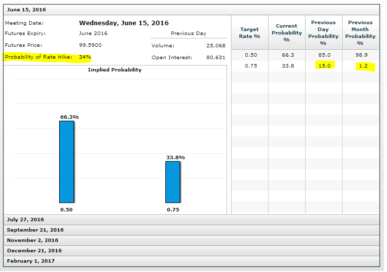 Enfin, nous avons vu aujourd’hui une forte volatilité quant au dollar canadien – ou indirectement le dollar américain avec la FED qui rendait public les discussions de leur dernière rencontre. En fait le marché tente continuellement de voir, prévoir ou anticiper un changement quant à la politique monétaire aux États-Unis qui a inévitablement un impact sur les devises. La grande question actuellement est de savoir quand sera la prochaine hausse de taux d’intérêt chez nos voisins du sud. Le marché s’attend à voir une hausse cette année, mais quand. Les probabilités ont fortement changé dans les derniers jours pour le meeting du 15 juin puisque le discours actuel laisse encore la possibilité de revoir les taux « si l’économie le permet ». La structure du marché s’ajuste en conséquence et l’impact se fait ressentir avec un dollar US plus fort et donc par opposition un dollar canadien plus faible. C’est un net changement d’air puisque le mois passé la probabilité implicite selon les 30-Day Fed Funds Futures étaient de seulement 1.2% pour une hausse de taux. Aujourd’hui c’est 34%. À mon avis il faudra voir des chiffres économiques assez fort pour forcer la main des américain à hausser les taux une semaine avant le référendum en Europe à savoir si le Royaume-Unis décide de quitter l’Union Européenne.