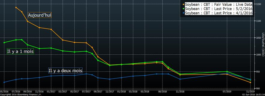 Au risque de se répéter, le prix du soya continue de monter, particulièrement le contrat de juillet. Aujourd’hui seulement, le prix de la fève de soya a augmenté de 4%, soit de 0.44 $US/boisseau alors que le contrat de novembre 2016 a augmenté de 1%... et le contrat de novembre 2017 a baissé! La structure à termes du complexe de soya démontre de plus en plus une forte demande à court terme (graphique 1). Il y a deux mois, les prix de l’ancienne récolte étaient inférieurs à ceux de la nouvelle récolte, le marché était en « contango » reflétant l’abondance de fève. Il y a un mois, la valeur du soya de l’ancienne récolte devenait légèrement supérieur à celle de la nouvelle récolte et aujourd’hui, et maintenant le prix de la livraison immédiate est rendu 6% plus cher que le soya de la nouvelle récolte. La structure à terme est désormais en « backwardation ». Évidemment, la situation est très similaire pour le tourteau. Ce changement de structure à terme coïncide normalement avec une hausse de la volatilité ce qui est effectivement le cas (graphique 2). La volatilité implicite des options a pratiquement doublé depuis 2 mois (graphique 2) démontrant une hausse de l’incertitude se traduisant pour une augmentation de la valeur des options (assurances). Aussi, ce changement de structure représente un risque au niveau des spreads spot/nouvelle récolte. Comme aujourd’hui, l’écart entre le contrat de juillet et novembre a littéralement doublé, passant de 30¢/boisseau à 60¢/boisseau (graphique 3).