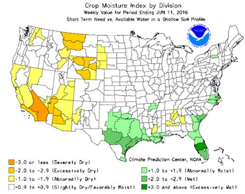 Dès l’ouverture du marché dimanche soir, le prix du maïs était 0.12 $US/boisseau en hausse et le soya 0.20 $US. Le prix du maïs de la nouvelle récolte a atteint un nouveau sommet en 2016, à 4.46 ¾ $US/boisseau ce qui est exactement le sommet fait en juillet 2015 (graphique 1). On peut donc dire qu’on a touché un niveau de résistance, il sera très intéressant de voir si ce niveau sera brisé ce qui offrirait beaucoup de potentiel au prix dont aucune autre résistance est en place avant 4.90 $US/boisseau. Le prix du soya nouvelle récolte a aussi fait un nouveau haut en 2016 à 11.86 ¼ $US/boiss., mais n’a pas gardé son momentum et a clôturé dans le rouge. Le marché de météo est en progression et on voit que la volatilité des marchés augmente semaine après semaine. La nouvelle du weekend était des craintes d’un manque d’eau aux États-Unis et de température trop chaude cette semaine ce qui a causé la panique. Néanmoins, lorsqu’on regarde les cartes météo (image 2), on voit qu’il y aura de 1 à 3 pouces d’eau au-dessus de Cornbelt ces prochains jours et que les sols ne manquent pas d’eau présentement (image 3). Il n’y a même pas un comté dans le cente ou l’est des États-Unis qui est légèrement en manque d’eau, les conditions sont superbes. Le rapport Crop Progress de ce soir le confirme, les conditions des cultures de maïs et soya ont tous deux été augmentées de 2% ce qui est mieux qu’anticipé. Il y a donc 75% des superficies de maïs qui sont en bonnes ou excellenets conditions, comparativement à 73% l’an dernier. Pour le soya, c’est 74% de la culture qui est en bonne posture, comparativement à 67% l’an dernier... si ça continue de la sorte, les rendements records de 48 boisseaux/acre en 2015 pourraient être battus. Dans le bilan de l’USDA, c’est encore le rendement « statistique » qui est en place, à 46.7 boisseaux à l’acre. Si le rendement de cet été égalise celui de 2015, on parle de 106 M boisseaux de plus en production… sans parler d’une possible augmentation des superficies. Ça mettrait donc les inventaires de soya moins serrés, présentement évalués à 260 M boisseaux pour la fin de l’année commerciale 2016-17.
