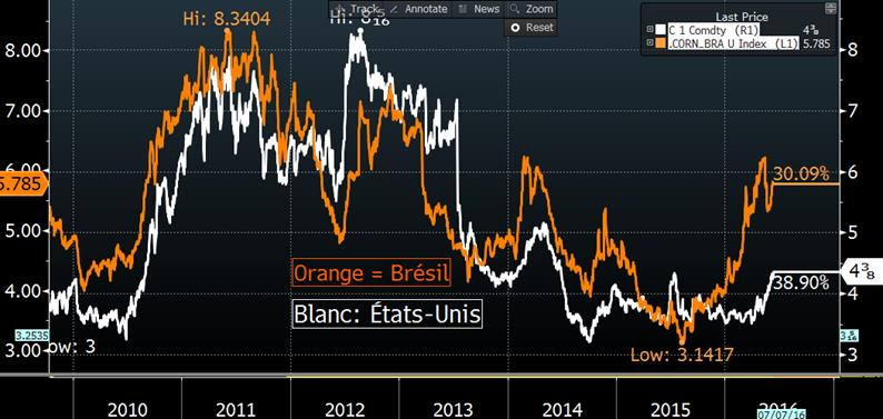 Actuellement, le prix des grains ressemble à une partie de souque à la corde : d’un côté nous avons la bonne condition des cultures américaines qui tire les prix vers le bas ; de l’autre côté nous avons la demande pour l’exportation qui tire le prix vers le haut. À court terme, je dirais que la demande semble la plus forte et traine la production américaine dans la bouette! Bien que nous avions des chiffres étonnamment bons concernant la condition des cultures aux États-Unis, le prix du maïs à tout de même finit la journée à 4.46 ½ $US/boisseau… toujours incapable de surmonter le sommet de l’été dernier qui était 4.46 ¾, mais on ne peut pas dire qu’on est loin. Techniquement, si on brise cette résistance, la prochaine cible s’avère très loin du prix actuel, soit 4.90 $US/boisseau. Pourquoi les perspectives pour l’exportation sont si fortes ? Le prix au Brésil est plus cher qu’aux États-Unis en raison du manque d’eau en avril-mai. Depuis le 1er janvier, le prix du maïs à la Bourse du Brésil a augmenté de 1.85 $US/boisseau, présentement à 5.78 $US/boisseau lorsque converti au taux BRL/USD du jour (graphique 1). Historiquement, il y a une bonne relation entre les prix au Brésil et aux États-Unis (graphique 2) et dernièrement, le prix américain traine de la patte. Toutefois, faut rester prudent avec les prix boursiers puisque la valeur du maïs FOB au port de Paranagua est juste au-dessus de 5.00 $US/boisseau (la base est donc négative). Cela reste tout de même au-dessus des prix américains, sans compter les problèmes de logistique possible en Amérique du Sud.