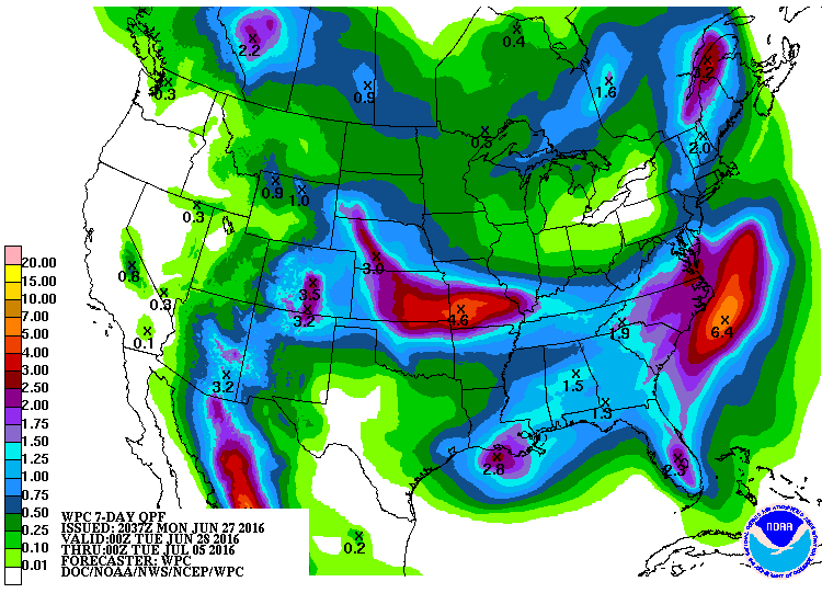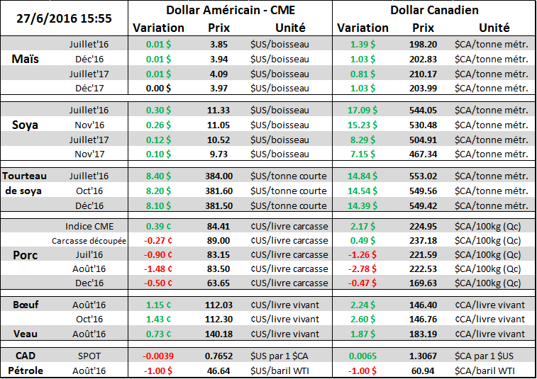 Blé d’hiver: la récolte va bon train avec 45% de sorti des champs. Les producteurs du Kansas vont mettre la 4e vitesse pour avancer les battages (58% actuellement, versus 50% en moyenne) avant que la pluie s’amène mercredi. Les cartes météo montrent des accumulations de 3 à 5 pouces d’eau du 28 juin au 5 juillet qui va nécessairement freiner les récoltes et augmenter le risque de toxines dans le grain. Je parle de risque de toxine, mais de manière générale le blé est d’excellente qualité avec des rendements qui fracassent des records. L’USDA a encore augmenté les conditions à 62% bon/excellent comparativement à 61% la semaine dernière et 40% l’an passé. Le blé est loin d’être dans le trouble malgré les précipitations prévues.