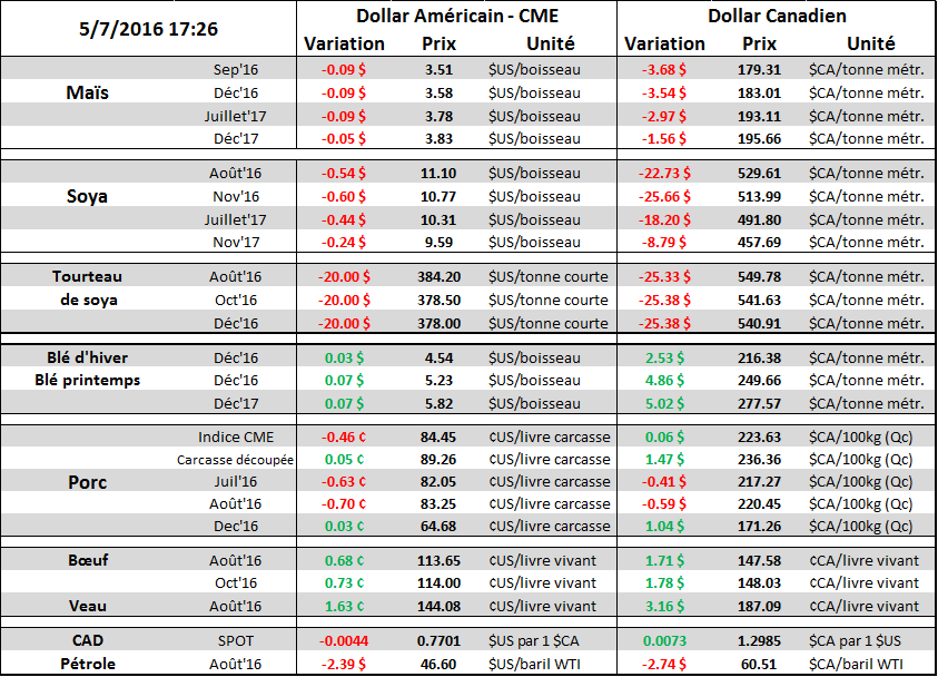 · Le prix du soya chute de 0.60 $US/boisseau, le prix du tourteau est « limit down »