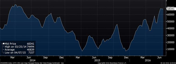 Sans surprise, les spéculateurs ont vendu du grain entre le 28 juin et 5 juillet (tableau 3). Les spéculateurs ont coupé leur position de presque moitié dans le maïs, passant de 175,000 contrats acheteur net à 103,333 contrats à la fermeture de mardi dernier. Ils ont moins liquidé dans le soya avec seulement 28,000 contrats vendus, ils maintiennent toujours une position nette de 167,000 contrats acheteur. Ce qui est possiblement le plus surprenant est qu’ils n’avaient toujours pas commencé à liquider leur position dans le porc, toujours avec 68,000 contrats. Cette position est similaire à celle que les spéculateurs avaient en 2014 (graphique 4) alors que le fondamental actuel est tout de même moins positif qu’il y a 2 ans. C’est possiblement un des facteurs qui expliquent la chute du prix du porc ces derniers jours, avec le contrat d’août à 78.90 ¢/lb contrairement à 90.00 ¢/lb il y a 3 semaines. Les spéculateurs liquident probablement leurs positions…