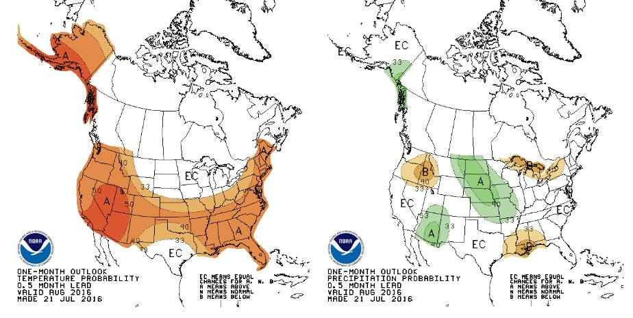 Prévision 8-14 jours : du 29 juillet au 4 aout. Température clémente sous les normales et précipitations normales.
