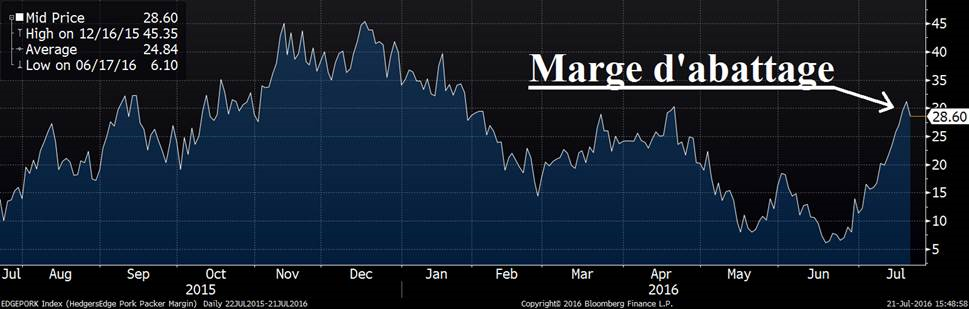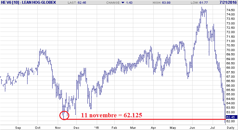 Le prix du cochon continu sa décente aux enfers avec une baisse de 1.425 cents sur octobre, une correction de 12 cents depuis la mi-juin. Techniquement les prix ont même chuté sous les bas du 11 novembre dernier à 61.775 avant de reprendre en après-midi et clôturer tout juste au-dessus à 62.45. Ce sera très important de voir le comportement du marché face à ce support absolu sur le contrat d’octobre 2016. Les baisses ont été plus marquées pour l’hiver, le printemps et l’été prochain avec un marché en fermeture de presque 3 cents. La météo clémente cette été amènera une abondance de grain a bon marché et les analystes s’adaptent à la possibilité de la poursuite de l’expansion du troupeau – faut-il encore que le prix du porc se maintienne car sinon les marges ne supportent plus cette théorie… Pour l’instant la demande est au rendez-vous car le prix de la découpe (88.91 cents) demeure élevé en comparaison du prix cash et les marges d’abattage empoche 28$ par porc – Une nette amélioration depuis un mois et un retour vers les valeurs de l’automne dernier.