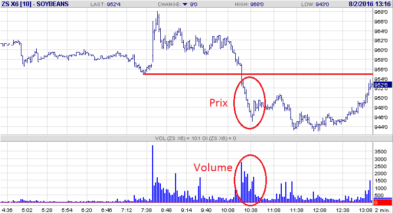 Un bon exemple de ce mouvement a été ce matin quand les prix ont franchi le support à 9.55. À ce moment-là nous avons vu le prix fortement chuter, le volume augmenter et représente un signe clair de vente sur ordre stop. Un ordre type des spéculateurs.