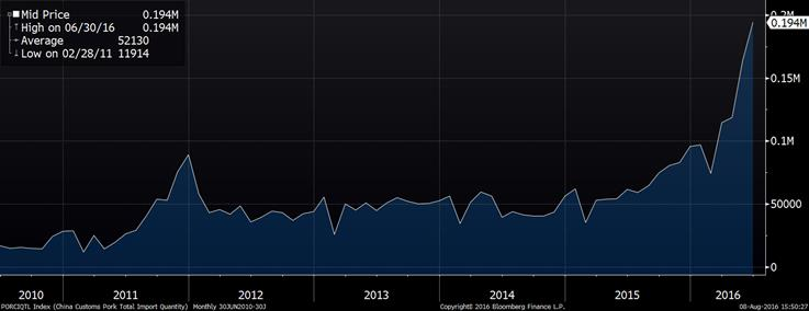 Au début juin, le marché du porc s’était grandement emballé suite aux anticipations d’exportations élevées vers la Chine. En effet, les exportations américaines de porc ont été plus fortes que l’an dernier et qu’en moyenne (graphique 1). Le volume de porc exporté moins celui importé (exportations nettes) totalisait 347 millions de livres, soit 9.4% de plus qu’en juin 2015 et 6.2% de plus que la moyenne 5 ans. Cependant, ce n’est pas directement la Chine qui a fortement influencé la hausse des exportations nettes, mais le Canada. En juin, la Chine avait acheté 71M livres de porcs américains ce qui est 18.5 millions de moins que le mois précédent (graphique 2). Cela est quelque peu décevant étant donné les importations de porc en Chine fracassaient tous les records en juin avec des achats de 194,000 de tonnes (427.5 M livres) ce qui était plus du triple des achats chinois de juin 2015 (graphique 3). Donc, la Chine achète plus, mais pas en provenance des États-Unis. Fort probablement que la Chine a acheté en provenance d’Europe, mais aussi du Canada ce qui expliquerait la chute des importations américaines de carcasses de porcs canadiens. Autrement dit, la Chine achète plus au Canada, donc le Canada vend moins aux États-Unis ce qui fait augmenter les exportations nettes américaines. Même si la Chine n’a pas augmenté son volume, les exportations nettes américaines ont bénéficié indirectement de la forte demande chinoise via le Canada. Plus concrètement, les États-Unis ont importé seulement 10M livres de porcs carcasses en provenance du Canada (graphique 4) contrairement à 35 millions livres en juin 2015. Même si les importations américaines de porcs carcasses canadiens ont diminué, ce n’était pas le cas avec les porcelets de 7kg et moins (graphique 5). On voit que le nombre de porcelets achetés par les américaines maintient une tendance haussière avec près de 300,000 cochonnets.