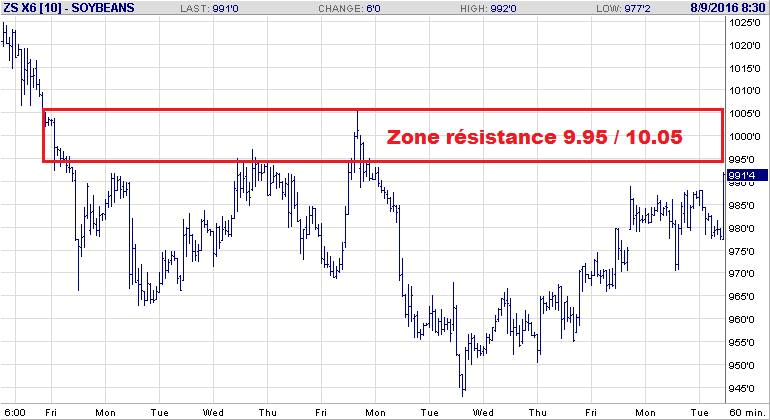 Les fonds de spéculation détiennent encore une position significative dans la fève avec 106 mille contrats/options acheteur, en perte de vitesse par rapport aux 200 mille du début de l’été. Évidemment avec les conditions des cultures exceptionnelles, une bonne partie des gestionnaires de fonds ont abandonnés leur pari d’un prix plus élevé dans le soja. Il reste encore beaucoup de place à liquider la position, un risque à tenir compte si jamais le rapport de vendredi est négatif pour les prix. À court terme le marché rencontre de la résistance aux alentours du 10$, niveau non seulement technique mais aussi psychologiques.
