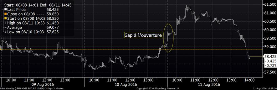 Le prix du porc avait ouvert en force ce matin. D’une part, il brisait la résistance baissière. D’autre part, il y avait un « gap » à l’ouverture (graphique 2) démontrant l’engouement des acheteurs. Le prix d’octobre s’est apprécié jusqu’à +2.5 ¢/lb au cours de la matinée, démontrant des signes de force. Tout cela s’est vite évaporé après la publication des prix des découpes de porc, démontrant une baisse de 2.21 ¢/lb pour la carcasse découpée de porc. Cette baisse de prix est principalement attribuable à la chute du prix du bacon qui a terminé la journée à 86.55 ¢/lb, en baisse de 11.6 ¢/lb. Depuis 3 semaines, le prix du bacon a perdu près de 40% de sa valeur (graphique 3), soit 56¢/lb ce qui est très anormale durant la période estivale. La demande semble être complètement absente cet été pour le flanc de porc. Suite à la publication du prix des découpes, le prix des contrats à termes a changé de direction pour finir la journée négative.