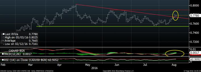 Cette semaine a été caractérisée par la faiblesse du dollar américain qui est retourné à son plus bas niveau en 2 mois face à l’ensemble des devises. Cette faiblesse est principalement expliquée par le délai estimé d’une hausse du taux d’intérêt aux États-Unis. Les données d’inflation américaines de cette semaine démontraient que les prix des biens et services n’augmentent pas très vite, inchangés depuis le mois de juin et en hausse de seulement 0.8% en 12 mois. De la sorte, les analystes prévoient que la Réserve Fédérale Américaine ne sera pas pressée d’augmenter les taux d’intérêt ce qui fait faiblir le $US. D’ailleurs, la FED publiait le compte rendu de sa dernière rencontre aujourd’hui à 14h00. Le comité monétaire semble divisé au sujet de l’évolution des taux américains malgré un marché d’emploi très fort et des risques économiques internationaux plus faibles puisque la crise du Brexit est passée. Les probabilités de voir une hausse de taux d’ici décembre 2017 est de seulement 75%. Rendu à ce point, le « surprise » se situe fort probablement du côté qu’une hausse de taux arrive plus vite qu’anticipé, le marché est rendu très pessimiste qu’en au taux d’intérêt américain. De plus, le prix du baril de pétrole reprend du poil de la bête, désormais à 47 $US/baril, ce qui vient supporter le huard. Toutefois, il faut garder en tête que la récente baisse du prix en juillet était expliqué par la surproduction ce qui n’a pas changé… le rebond des derniers jours provient de la rencontre devancée des pays de l’OPEP ce qui laisse croire qu’ils pourraient vouloir restreindre leur production pour faire augmenter les prix. Néanmoins, toutes les dernières tentatives de faire réduire la production n’ont pas fonctionnées. Avec la faiblesse du $US et le rebond du prix du pétrole, le dollar canadien avoisine le seuil de 0.78 $US (graphique 1) et a brisé à sa résistance.