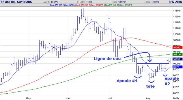 Soja : une autre journée où l’USDA annonce des ventes pour la nouvelle récolte, un total de 381,000 tonnes métriques cette fois ci qui s’additionne au plus de 2.5 millions de tonnes bookés depuis le début du mois. Pour le prix de novembre-16, nous sommes toujours au-dessus du 10$ avec la force de l’exportation ainsi que la faiblesse du dollar américain qui favorise la demande. Les cours actuels sont en train de tester un niveau technique très important. L’analyse technique permet de constater une figure de renversement de type « tête-épaule » et chatouille maintenant l’importante résistance du canal baissier à 10.18$bu. Si jamais les prix franchissent cette résistance cela confirme, toujours sur une base technique, le renversement de vapeur. Les prochaines résistances seraient à 10.30 et 10.54 sur les moyennes mobiles 100 et 50 jours.