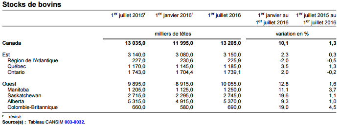 · Cheptel canadien de bœuf : 13.2 millions, soit 1.3% de plus qu’en 2015