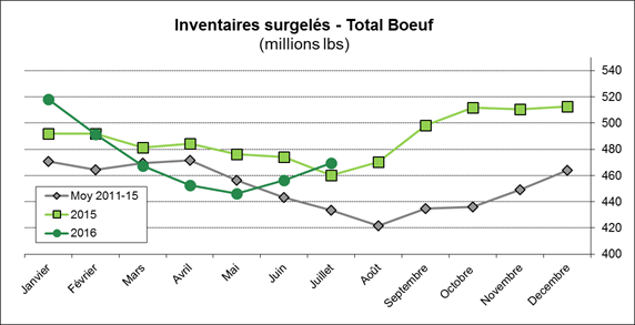 · Inventaires surgelés de bœuf à 469 millions de lbs, au-dessus de la moyenne 5 ans et de 2015