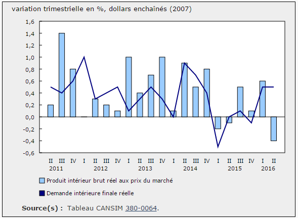 Ce matin, Statistique Canada publiait les données du PIB pour le mois de juin. C’est sorti mieu que prévu avec une croissance de 0.6% en juin (est. 0.4%) mais des révisions ont été fait sur les mois précédents. De la sorte, le deuxième trimestre de 2016 est moins bon que les attentes des économistes avec une croissance négative de -0.4% (-1.6% annualisé). Il s’agit du recul du PIB trimistriel le plus prononcé depuis la mi-2009. Si on enlève les répercussions des feux de forêt de Fort McMurray qui a occasionné une baisse de la production de pétrole, le PIB réel aurait seulement progressé de 0.1% ce qui n’est pas fameux. Évidemment, ce sont les exportations qui ont subit le choc économique des feux de forêt en Alberta : les exportations de produits énergétiques (-7.5%) ont été entraînées à la baisse par une chutre des exportations de pétrole brut et bitumineux (-9.6%) ainsi que des exportations de produits pétroliers raffinés (-19.6%). Au final, les exportations de biens et services ont diminuée de 4.5% au deuxième trimestre, alors que les importations ont augmenté de 0.3% ce qui n’est également pas bon pour la croissance économique du pays.