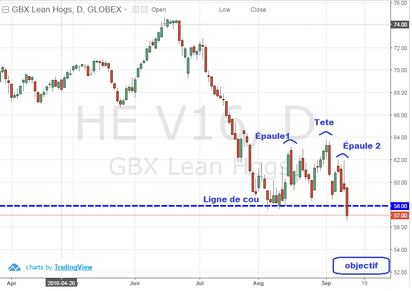 Lean Hog : journée extrêmement négative dans le secteur porcin avec une basse de 2.3 cents sur octobre et nous donne un signal technique très bearish sur un graphique. Premièrement il y a une nette figure de renversement de type « tête-épaule » ; en traversant la ligne de cou vers le bas, le signal technique nous donne une cible à 52.50 cents. Qui plus est, la baisse d’aujourd’hui crée un nouveau bas qui ne fait qu’accélérer les signaux de ventes. D’un point de vue fondamental la découpe se maintient à 81.45 en hausse de 0.42 mais c’est le cash qui dégringole avec l’index à 64.07 encore en baisse aujourd’hui selon la tendance saisonnière.