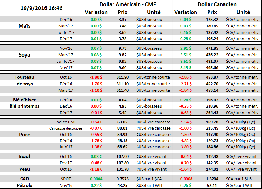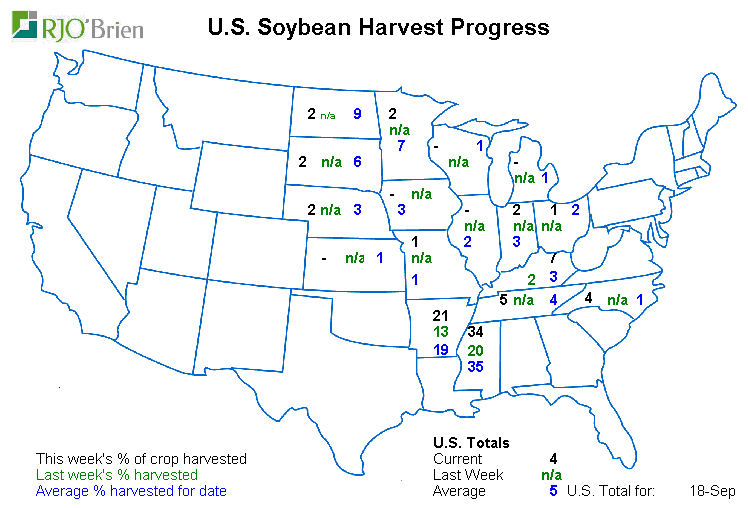 Coté récolte la maturité (perte de feuille) est à 46% comparativement à 50% l’an dernier et 43% en moyenne. Pour la première fois l’USDA publie l’avancée des battages de fève cette année avec un mince 4% légèrement sous les moyennes (5%). Évidemment le gros du travail est habituellement en octobre et il faudra tout comme pour le maïs laisser passer les averses des prochains 10-15 jours avant de réellement passer en 4e vitesse.