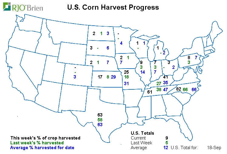 Au niveau de la progression des récoltes, la maturité avance très bien avec 53% de blé d’inde denté, comparativement à 48% l’an dernier et 48% en moyenne. Les récoltes aussi ont progressé, quoique faiblement car elles sont rendues à 9% en date du 18 septembre donc exactement comme l’an dernier et un peu en arrière des moyennes à 12%. On s’attend à voir un léger retard d’ici la fin du mois puisque les cartes météos montrent des précipitations sur presque l’ensemble du territoire pour les deux prochaines semaines.