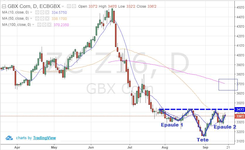 À propos du soja : très bon début de semaine à Chicago avec les prix qui poursuivent leur rebond. On se souvient la semaine dernières nous avons touché les supports à 9.40 $bu avant de repartir dans la direction inverse. D’un point de vue technique nous avons aussi une formation technique de tête-épaule qui n’a pas été confirmé. À l’inverse même – les prix n’ont pas été en mesure de franchir la ligne de cou. Les cours viennent maintenant chatouiller les résistances tracées par la tendance baissières depuis le mois de juillet.