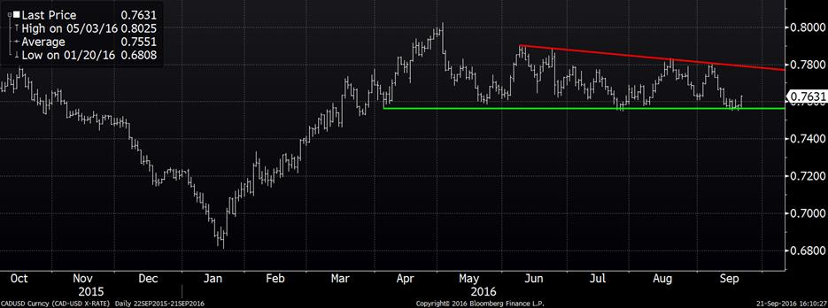 Hier, le gouverneur de la Banque du Canada, Stephen Poloz, disait que les taux d’intérêt resteront faibles encore longtemps au Canada. Ce commentaire est fondé sur des perspectives de croissance plus faible qu’anticipée il y a quelques années. Bien que la nouvelle ne surprenne personne en raison des derniers chiffres publiés sur croissance économique, cela n’était pas un élément en faveur d’un dollar canadien fort. Depuis près d’une semaine, le CAD se transigeait légèrement sous la barre du 76.00. Aujourd’hui, c’était au tour des américains de parler de leur taux d’intérêt. En ligne avec les attentes, le taux d’intérêt américain est maintenu en place, mais la FED ouvre la porte à une hausse prochainement. Les probabilités de voir une hausse de taux en décembre sont rendu à 63%, soit 5% de plus qu’hier. La banque centrale assure que les arguments en faveur d’une nouvelle hausse se sont renforcis, mais attend toujours du progrès pour le plein emploi et une inflation à 2%. Le dollar canadien a donc rebondi sur son support pour finir la journée avec un gain 0.6 ¢US à 76.35.