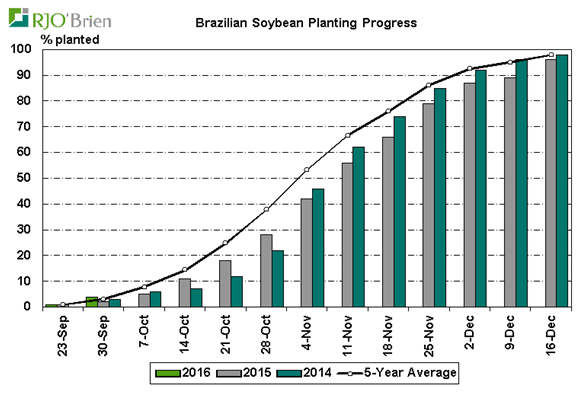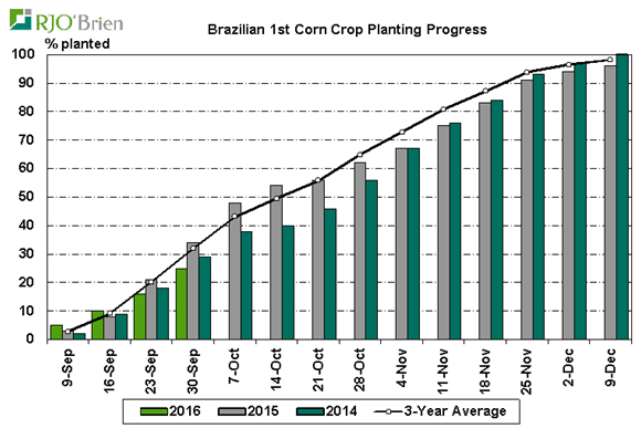 Cette semaine les semis de maïs passent de 16% à 25% complétés, en retard par rapport à l’an dernier (34%). Les régions de Rio Grande, Santa Clarina et Parana sont les plus en retard. Le bilan offre-demande du Brésil est extrêmement précaire et la production DOIT être au rendez-vous sinon faudra se fier encore au programme d’export américain.