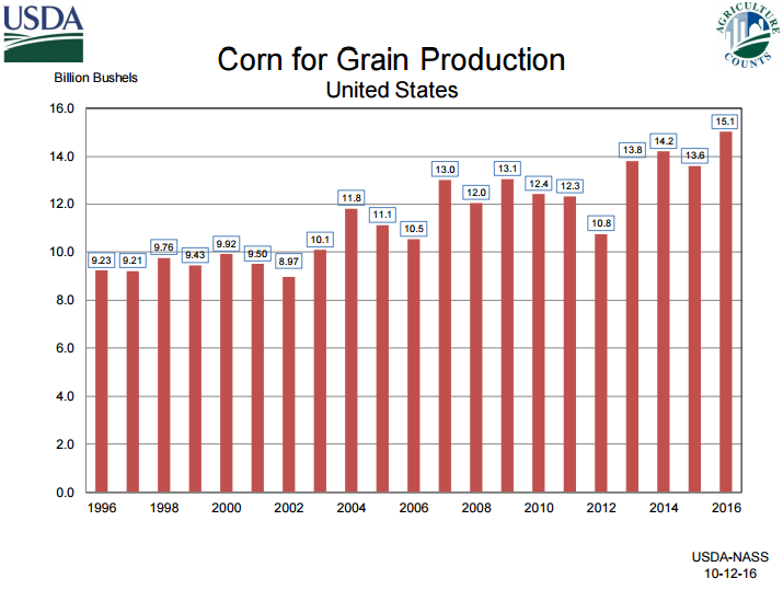 Soja : Au niveau de la production l’USDA hausse le rendement de 0.8BPA en ligne avec les prévisions et ajoutent donc 68 millions de boisseaux à la production qui atteint un record de 4.269 milliard de boisseaux. Quant à la demande, tout se joue au niveau de l’export qui a été revu à la hausse de 40 millions de boisseaux. L’exportation se porte très bien avec plus d’un milliard de boisseaux déjà dans les livres, par contre la cible était déjà « élevée » à 1.985 alors on ne sentait pas réellement le besoin de modifier significativement le programme d’export américain. Au niveau actuel d’exportation (1.040 milliard) cela représente 52% de la cible annuelle et cela est dans les moyennes, voire même un peu en dessous. Comme je dis ce n’est pas complètement fou d’augmenter l’exportation de 40 millions, mais c’est optimiste et peut-être prématuré à ce stade-ci. Par contre, le ministère a régulièrement sous-estimé l’exportation en début d’année et je pense qu’ils tentent de s’ajuster pour 2016/17 pour éviter qu’encore une fois le carry passe de 400 millions à l’automne à 150 quelques mois plus tard à cause d’une demande plus forte que prévue.