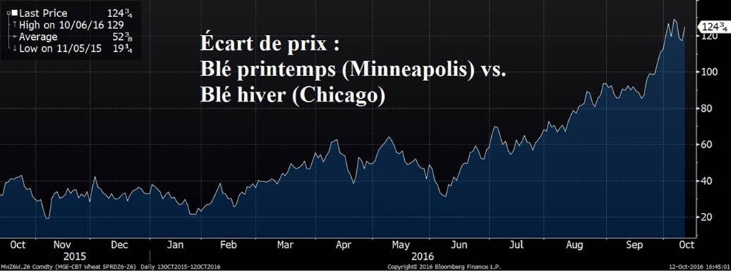 Blé : Le rapport d’aujourd’hui était beaucoup plus sensible à la demande car la récolte est derrière nous et selon des modifications mineure étaient à prévoir. L’USDA ne touche pas au rendement record de 52.6BPA mais réduit légèrement la production en baissant les surfaces. Évidemment à cause du rapport Grain Stock du 30 septembre dernier, le marché s’attendait à voir une réduction de la consommation pour l’élevage. Les stocks plus élevés il y a deux semaines impliquaient que les américains n’ont pas favorisé le blé au détriment du maïs malgré la baisse de prix et l’abondance du blé. En fait, les deux type de grains sont en abondance, alors l’éleveur a l’embarras du choix, disons. Bref, l’USDA a été forcé de revoir en baisse de 70 millions de boisseaux la consommation. La légère baisse de production ainsi que la moins bonne demande fait en sorte que les inventaires de fin passent à 1.138 milliard de boisseaux, soit des niveaux rarement atteint depuis des décennies. Le point à mentionner ici est l’abondance de blé d’hiver qui fait clairement contraste au blé de printemps (base Minneapolis, haut niveau de protéine). La demande pour la qualité est claire, comme le témoigne le graphique ci bas de l’écart de prix en le blé printemps (Minneapolis) et celui d’hiver (Chicago).