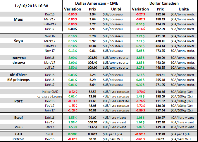 D’autre part, les membres de la National Oilseed Processors Association (NOPA) ont consommé 129.4 millions de boisseaux de soya en septembre ce qui est un volume record depuis 9 ans. L’an dernier, les membres de la NOPA avait consommé 126.7 millions de boisseaux et la moyenne des estimés étaient de 127.7 millions. Cela démontre que la demande de tourteau reste forte ce qui est positif pour le prix de la fève soya. Selon la relation entre le NOPA crush et le rapport national fait par l’USDA, la consommation totale de soya pour la trituration devrait être près de 138 millions de boisseaux. Les estimés 2016/17 de l’USDA totalisent 1.95 milliard de boisseaux ce qui représente une augmentation de 3.5% de plus que les volumes de l’an dernier, alors que le NOPA crush de septembre démontre une augmentation de 2.1%. Même s’il y a eu plus de soya trituré qu’anticipé, les inventaires d’huile de soya sont inférieurs aux attentes à 1.376 milliard de livres. Conséquemment, le prix de l’huile de soya a bondit d’une cent la livre (+3%) à 35.44 ¢ pour le contrat de décembre.