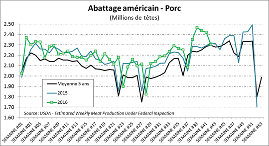 La semaine dernière, les abattages de porc aux États-Unis étaient plus faibles qu’en 2015 par 0.6% à 2.3 millions têtes. Cette baisse de production est principalement expliquée par l’arrêt des opérations de Smithfield Foods en Caroline du Nord en raison de l’ouragan Matthew au début de la semaine dernière. La production s’établit donc à 482 millions lbs, en baisse de 1.7% versus l’an dernier. Il sera intéressant de suivre les abattages de la semaine pour voir s’il les animaux non-abattus de la semaine dernière se retrouveront à l’abattoir de cette semaine. Les abattages d’hier étaient de 441,000 porcs comparativement à 406,000 l’an dernier et 385,000 têtes la semaine dernière.
