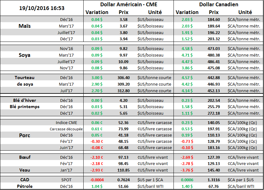 Le prix du maïs a terminé la journée à la hausse pour une 6ème journée en 8 séances, propulsé par les données sur la production d’éthanol. La semaine dernière, la production a bondi à 998,000 barils/jour comparativement 962,000 la semaine précédente. Le rapport démontre aussi une contraction des inventaires d’éthanol qui sont désormais à leur plus faible niveau depuis novembre 2015, en baisse de 351,000 barils à 19.04 millions. Bien qu’il n’y ait pas une grosse différence entre les inventaires actuels et ceux de l’an dernier, le facteur « positif » est que le surplus d’éthanol s’est finalement écoulé puisque nous étions largement au-dessus des réserves de l’an dernier cet été.