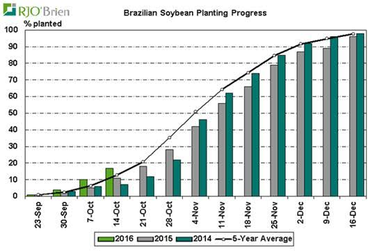 Au Brésil, les ensemencements de soya s’accélèrent rapidement permettant d’augmenter l’avance que les producteurs ont. Les provinces les plus en avance sont également les plus importantes : Parana et Mato Grosso ont respectivement 38% et 31% des superficies d’ensemencées. De la sorte, il y a déjà 17% des surfaces totales qui ont été ensemencées dans le soya comparativement à 10% la semaine dernière, 11% en 2015 et 12% en moyenne. Dans le maïs, les semis sont complétés à 51% après 6 semaines de travail dans les champs. Les brésiliens sont donc toujours en ligne avec la normale.