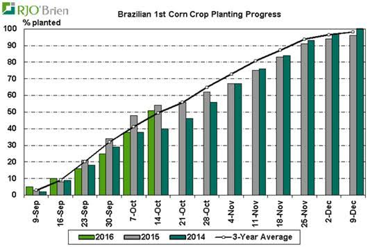 · Au Brésil, 17% du soya et 51% du maïs sont plantés. En avance sur la moyenne 5 ans
