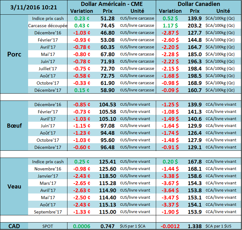 Le marché continue de nous démontrer une tendance à la hausse à court terme, même si une baisse significative peut arriver prochainement en raison du faible écart entre le cash et le CàT de décembre. Il semble difficile d’apercevoir un ajustement du prix des produits de porcs qui reflètent l’abondance d’abattage ces derniers jours. Sur le long terme, il sera important d’augmenter le niveau d’exportation, autrement les consommateurs feront face à une abondance de viande sur les tablettes. Le CàT de décembre a clôturé à la hausse pour terminer à 47.45¢/lb. La marge des abattoirs demeure élevée et les valeurs du porc à la découpe, selon l’USDA hier à la fermeture, sont à la baisse de 2.37¢/lb comparé à mardi pour une valeur de 71.53¢/lb. Le plus bas depuis le 21 Octobre ce qui a causé une baisse de 1¢/lb à l’ouverture du marché de ce matin.