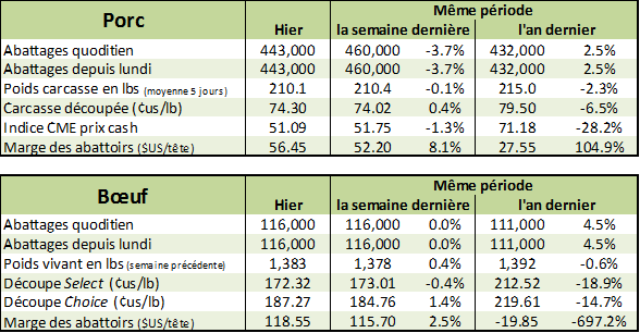 Du côté du porc, après avoir connu une semaine record du niveau d’abattage, des actions ont été prisent afin d’aider le prix à la découpe et c’est probablement ce qui a aidé prix du CàT à finir la journée d’hier dans la zone positive. On pourrait peut-être s’attendre à une tendance similaire aujourd’hui en autant que les prix des découpes restent élevés. Le prix à la découpe a clôturé à 74.30 ¢/lb hier, à la hausse de 0.79 ¢/lb, propulsé par la valeur du jambon qui était en hausse de 2%, 9% et 21% sur la journée d’hier, les 5 derniers jours et depuis 1 mois respectivement.