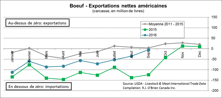 · Importations nettes de bœuf en septembre : 4.7 M lbs, soit 119 M de moins que l’an dernier