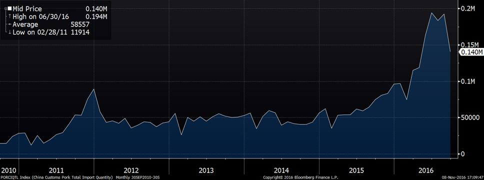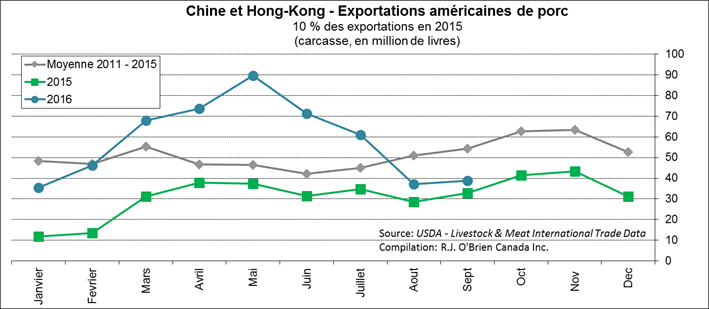 Pour le porc, les exportations américaines en septembre totalisaient 415.7 M lbs dont 35% de ce volume s’est dirigé vers le Mexique et 23% vers le Japon. Cependant, il ne faut pas négliger les importations de 84.4 M lbs dont le trois-quart provient du Canada. Au net, il y a eu 331.3 M lbs de porc qui est sorties des États-Unis en septembre ce qui est 6% de plus qu’en septembre 2015. On ne peut pas dire que les exportations sont mauvaises, nous sommes également au-dessus de la moyenne 5 ans (par un maigre 1.6%). La déception provient encore de la demande chinoise qui reste sous la barre du 40 M lbs alors que leur importation de viande porcine a atteint 308.5 M lbs en septembre soit 88% de plus qu’en septembre 2015. La part des américains ne s’élève qu’à un maigre 13% des achats chinois.