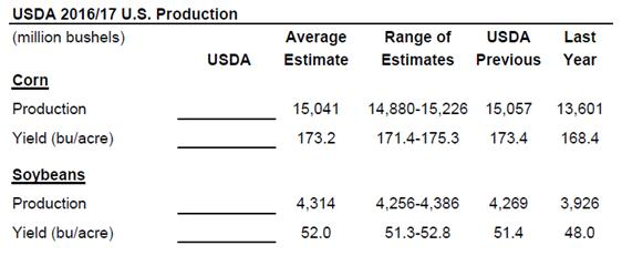 Dans le maïs, moins de changement est attendu. La moyenne est estimés du rendement est similaire à celui rapporté le mois dernier, mais on note que l’étendue des estimés est relativement large (de 171.4 à 175.3 boiss./acre). Récemment, la demande pour le maïs s’est avérée très forte, il faudra aussi surveiller si l’USDA augmentera ses prévisions pour l’éthanol ou l’exportation.