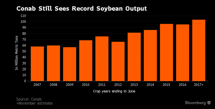 Concernant les ventes hebdomadaires à l’exportation, le carnet de commande du soya s’est rempli un peu moins vite qu’attendu. Le volume de soya vendu entre le 28 octobre et le 3 novembre représente seulement la moitié des estimés à 1.1 millions de tonnes alors que ceux du tourteau de soya arrivent dans le bas des prévisions à 155,700 tonnes. Les ventes de maïs sont en ligne avec les prévisions à 1.23 millions de tonnes tandis que ceux de blé ont surpassé les attentes avec 769,600 tonnes.