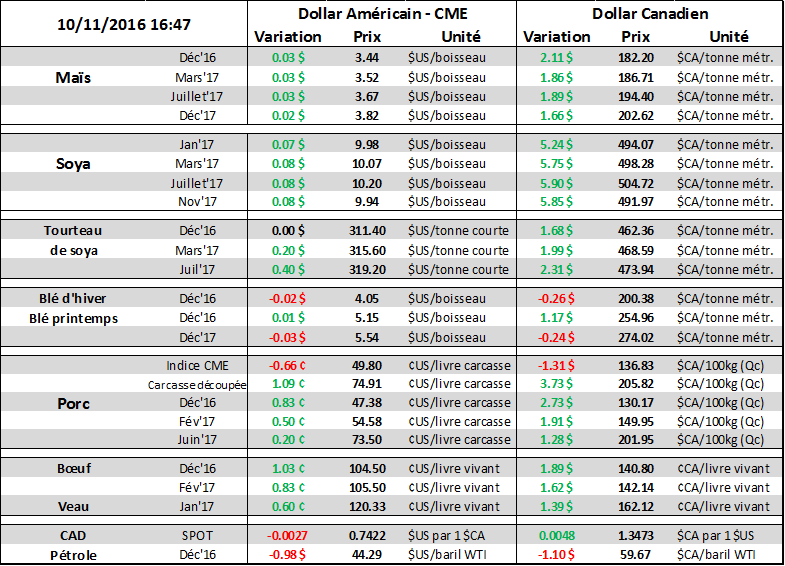De plus, CONAB (l’agence statistique brésilienne) prévoit que le Brésil, le plus important exportateur de soya, aura une plus petite production de fève que prévue en octobre puisque les surfaces s’avèrent 0.2 millions d’hectares moindre. Cela est causé par un retard dans l’état du Parana. Toujours selon CONAB, cela n’empêchera pas d’atteindre une production record, à 103.5 millions de tonnes ce qui serait 8.5% de plus que la récolte précédente. Par ailleurs, la récolte estivale de maïs devrait s’établir à près de 10% au-dessus des quantités de l’an dernier, soit 28.6 millions de tonnes. À cela s’additionnera la récolte d’hiver, Safrinha, pourrait atteindre 56 millions ce qui donnerait une production annuelle de maïs à 84.6 millions de tonnes, soit 27% de plus que l’an dernier. Il ne faut pas oublier que la production de Safrinha avait été désastreuse l’été dernier en raison d’un manque d’eau ce qui avait causé une hausse du prix du maïs au printemps dernier.
