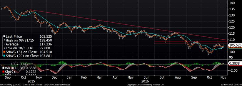 Les marchés sensibles comme le cuivre, le coton ou les obligations démontrent que les changements au plan fiscal pour 2017 favorisent les consommateurs à dépenser ce qui serait également favorable pour la consommation de protéine. Ce qu’on peut observer de la journée d’hier, c’est que le marché semble avoir un bon support et signe d’augmentation de la demande ou de ralentissement des abattages qui pourraient renverser la tendance et emmener le marché à la hausse. Par contre, faudra surpasser deux petites résistances à court terme soir les sommets du début novembre et mi-septembre. Le CàT de février a terminé légèrement à la hausse hier pour faire des hauts sur les 5 derniers jours. Contrairement à hier où on mettait l’emphase sur la possibilité de baisse des exportations et la faiblesse du peso mexicain, aujourd’hui on peut apercevoir un regain de la demande, soit plus d’argent dans les poches des consommateurs… comme quoi le marché ne sait plus dans quel sens aller depuis les élections. Le prix du bœuf à la découpe a terminé à 185.59$/lb hier, légère baisse sur la semaine d’avant. Au Texas, le marché du prix cash était à 102$/lb par 107$/lb, ce qui nous montre une fois de plus la volatilité du marché.